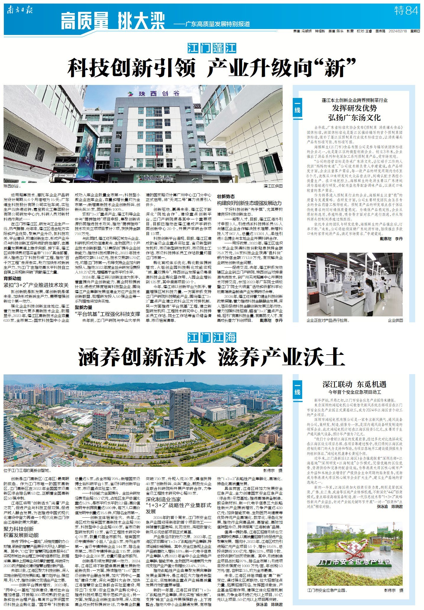江海区将用“创新活水”浇灌“产业之花”,促进产业与科技互促双强,促进产城人融合发展,为在推进中国式现代化建设中奋力再造一个现代化新江门作出江海新的更大贡献。