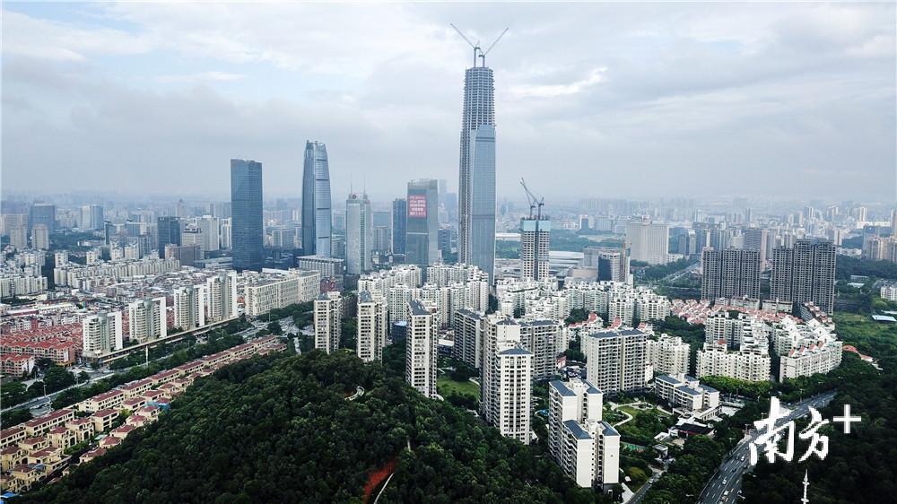 上个月,东城核心地段、黄旗山下的民盈·国贸中心2号楼超高层建筑成功封顶,将东莞天际线抬高到423米,成为“东莞第一高楼”。