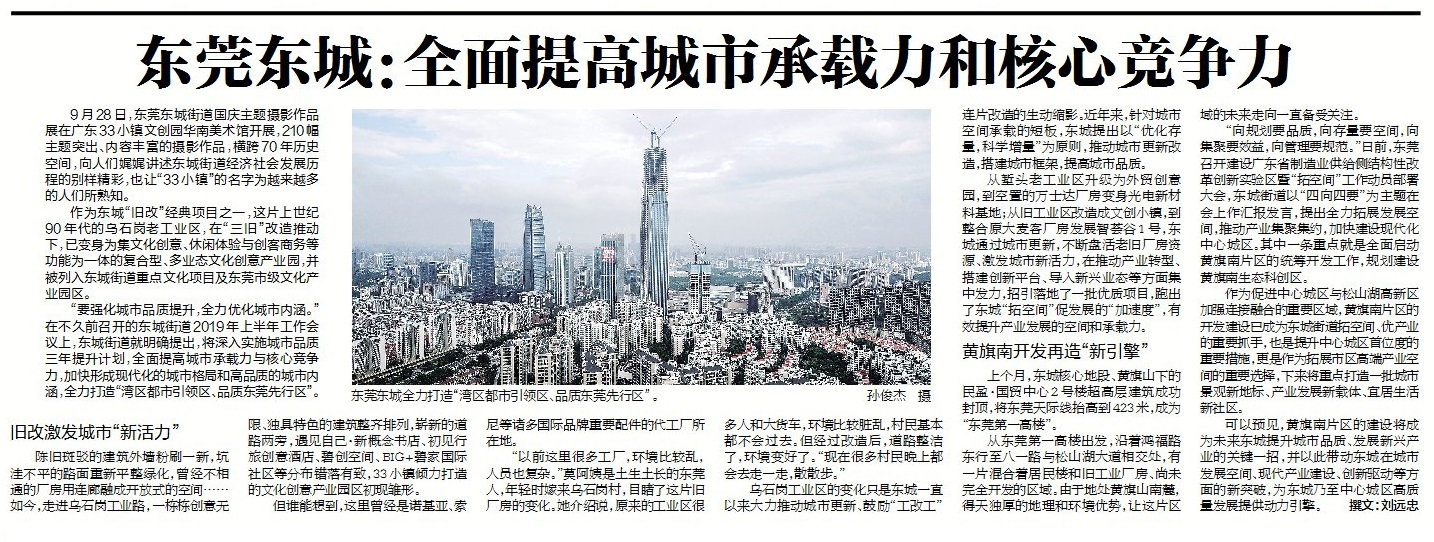 “要强化城市品质提升,全力优化城市内涵。”在不久前召开的东城街道2019年上半年工作会议上,东城街道就明确提出,将深入实施城市品质三年提升计划,全面提高城市承载力与核心竞争力,加快形成现代化的城市格局和高品质的城市内涵,全力打造“湾区都市引领区、品质东莞先行区”。