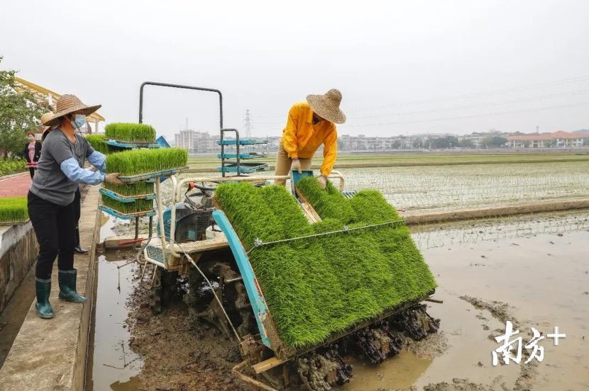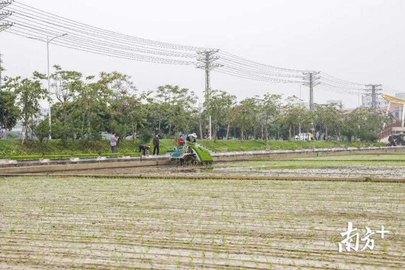 记者在现场看到,一排排秧苗被从拖拉机上卸下来,静静地摆在田边上,再由工作人员把它们逐一装到插秧机上。嫩绿的秧苗“上架”后,两台插秧机分别在农田上来回“奔跑”着,每过一处,都会留下一株株插好的秧苗。不一会儿,黄色土地的农田就变成一片铺满淡绿色的希望之地。