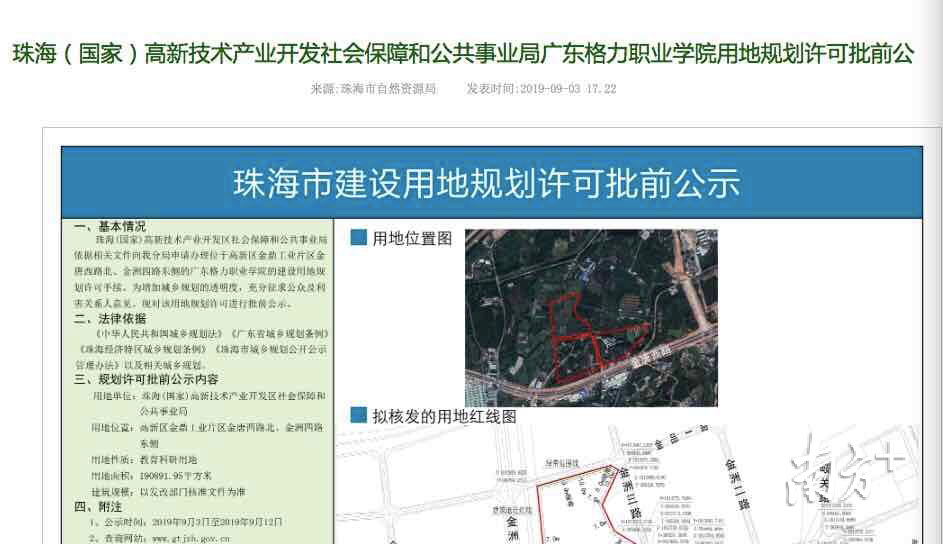 9月3日,珠海市自然资源局网站发布《珠海(国家)高新技术产业开发社会保障和公共事业局广东格力职业学院用地规划许可批前公示》显示,广东格力职业学院项目用地面积达19万平方米。