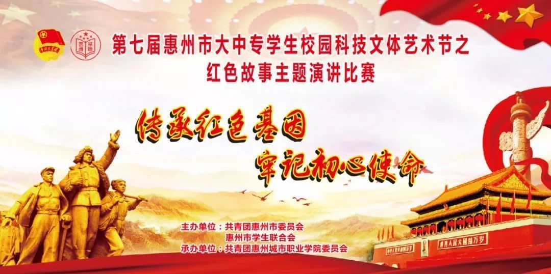为纪念中华人民共和国成立70周年,五四运动100周年,激励我市广大青年学生追寻先辈足迹,传承红色基因,牢记初心使命。5月29日下午,团市委、市学联主办,惠州城市职业学院承办的全市大中专学生红色故事主题演讲比赛在惠州城市职业学院明德报告厅举行,这项比赛作为第七届大中专学生校园科技文体艺术节的子项目之一,也是今年新增的项目,学生们用包含深情、铿锵有力的的演讲打响了本届科技文体艺术节的“第一炮”。