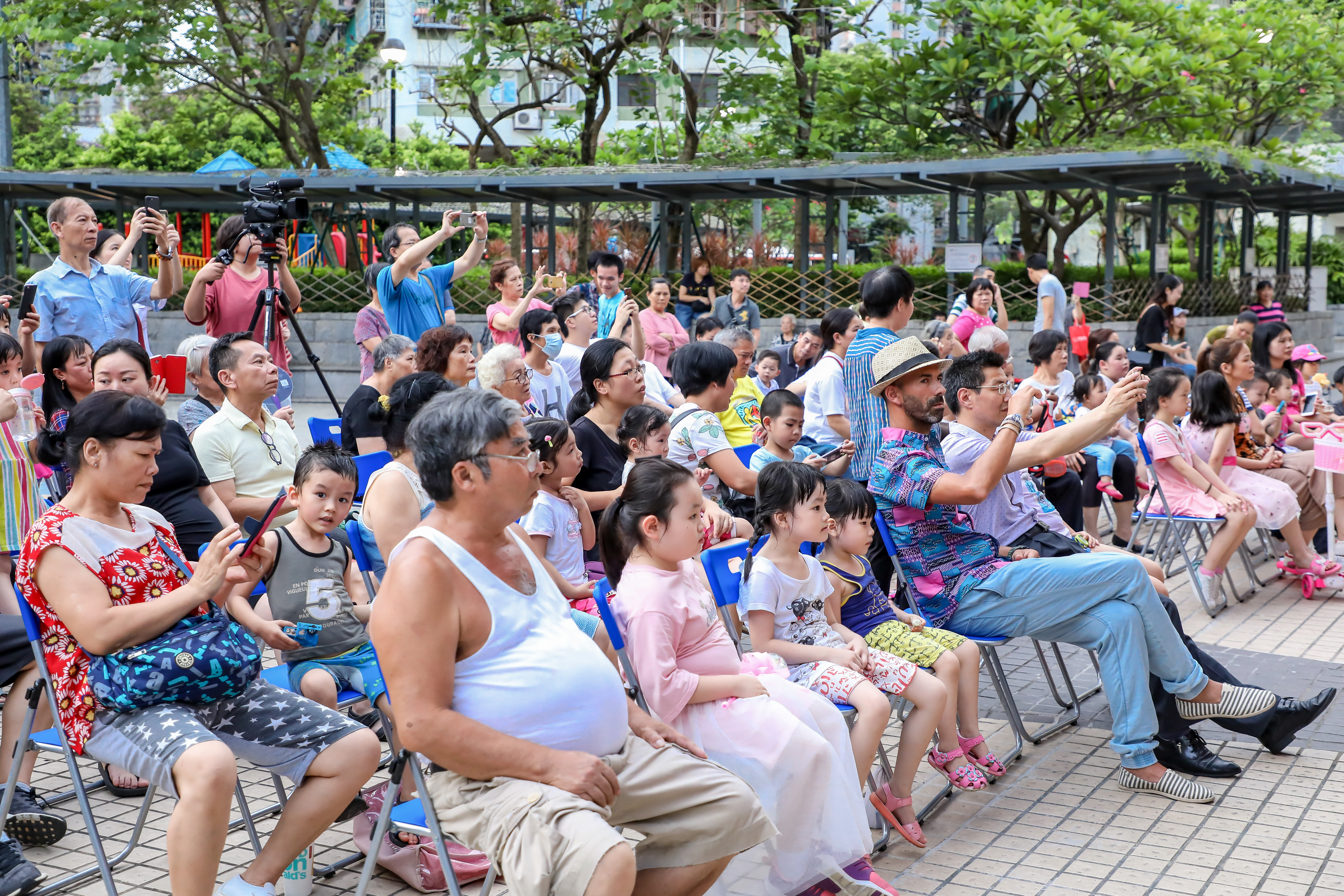 6月30日傍晚时分,佑汉街巿公园华灯初上,舞台前很早就坐满了一家老少前来纳凉的市民。↓