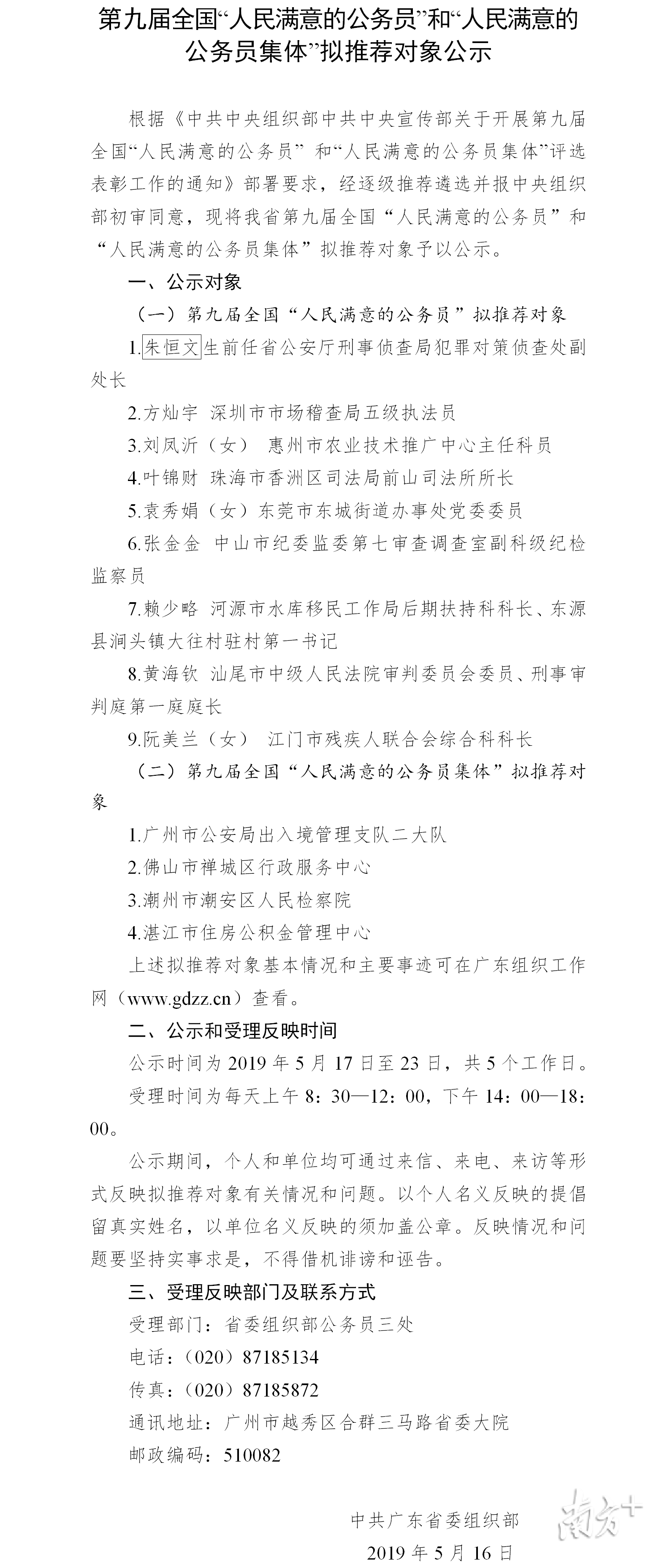 5月16日,广东省委组织部公示了拟推荐的第九届全国“人民满意的公务员”和“人民满意的公务员集体”,包括9名个人和4个集体。