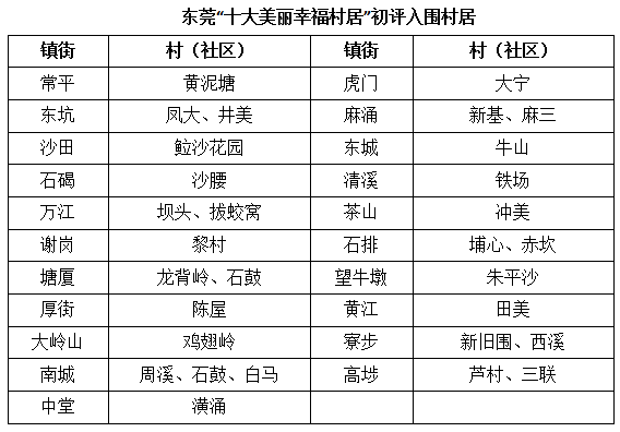 评选启动以来,东莞多个村居踊跃报名,提交了大量“美丽幸福村居”图文素材。近日,经过东莞市宜居办组织初评,评出了30个村居,入围“十大美丽幸福村居”。初评结果如下: