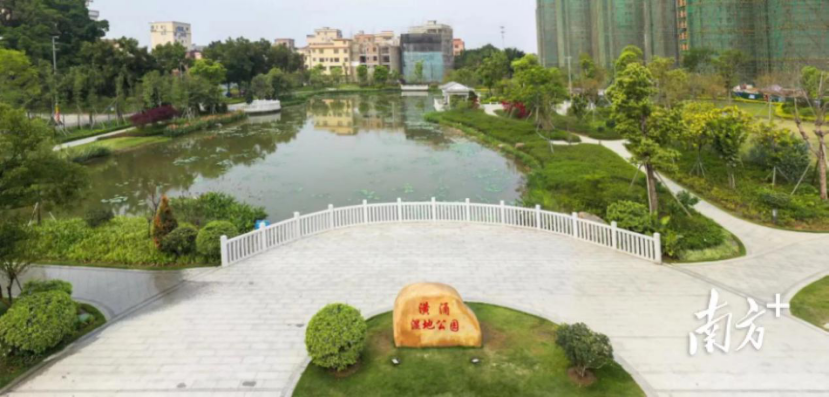 漫步在潢涌村充满岭南水乡特色的湿地公园,只见一片又一片荷叶铺满了整个池塘,新修的小径被绿荫遮住阳光,所触所感都是绿色,让人好不惬意。不远处还有一所新建的公厕,整个公园环境优雅、设施齐备。