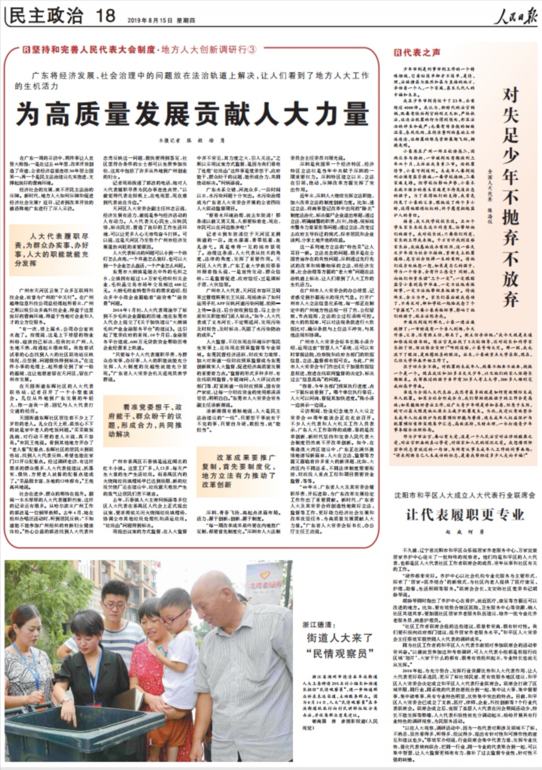 8月15日,在人民日报的民主政治版块中“坚持和完善人民代表大会制度-地方人大创新调行” 大篇幅报道了“为高质量发展贡献人大力量”的报道,其中大朗人大工作也在报道中被提及。