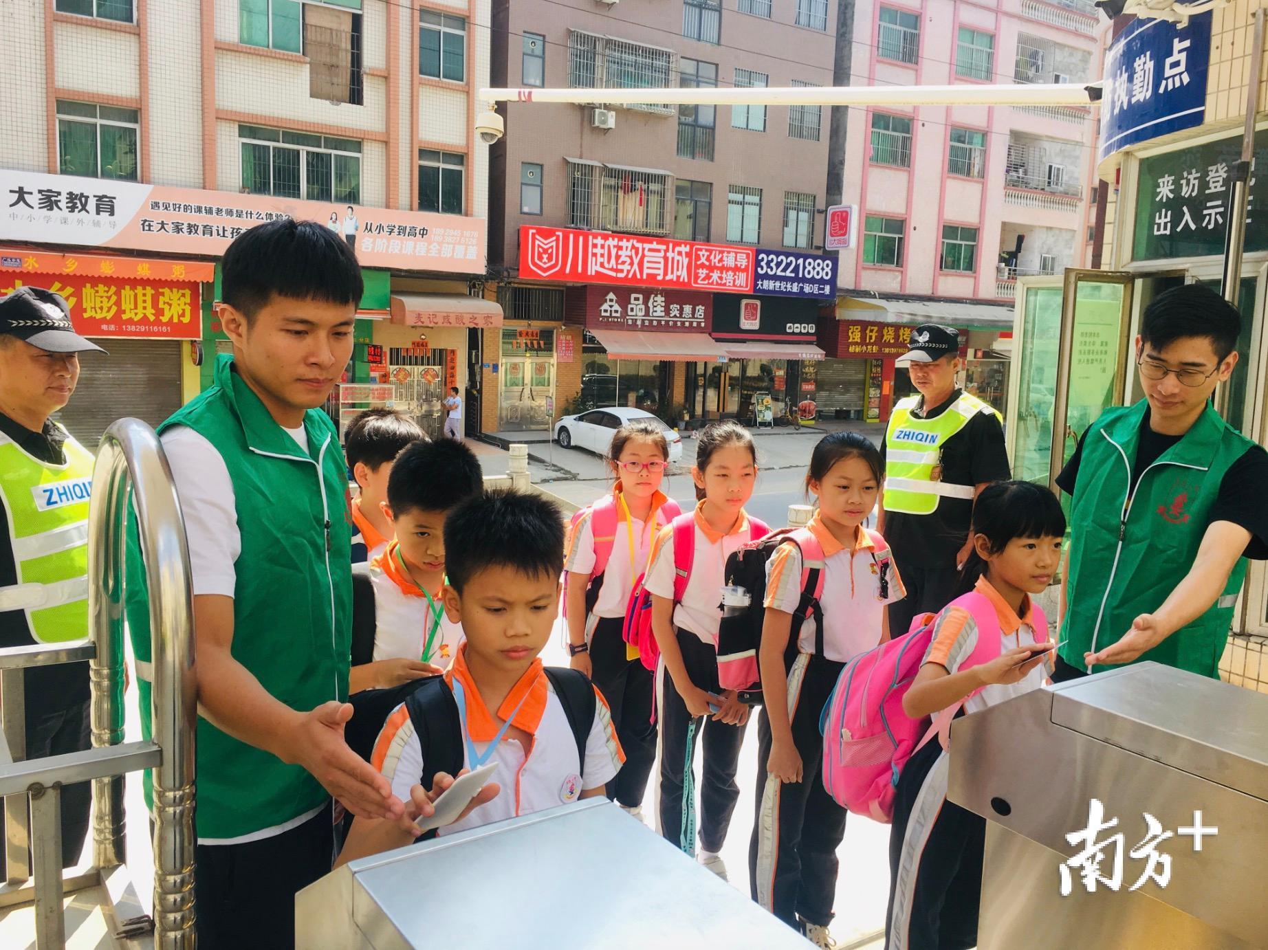 正值放学时间,大朗各间学校的门口看到多个升降柱缓缓升起,阻挡从门口进出的车辆。专职保安人员佩戴齐全防卫器械,站立在校门口两边,认真地观察着周边的环境以防出现突发状况。“滴!”在如此严谨的安保之下,学生和家长安心且有序地刷卡进出校园。