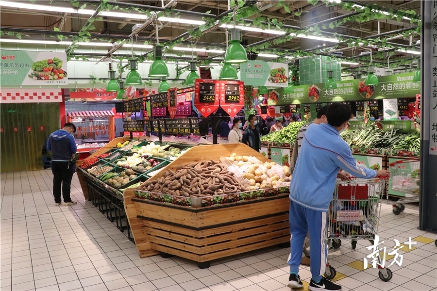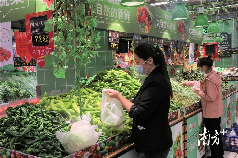 记者在大朗的超市果蔬区域看到,各类蔬菜瓜果种类繁多,在价格上并没有见到明显的上涨,菜价在2.5元-6.5元不等。据超市相关负责人介绍,疫情发生以来,超市方面严格落实防疫措施,全力保供应、促流通、稳物价。并且超市及时应对,将肉类、菜类进货量提高一倍,满足市民群众需求。