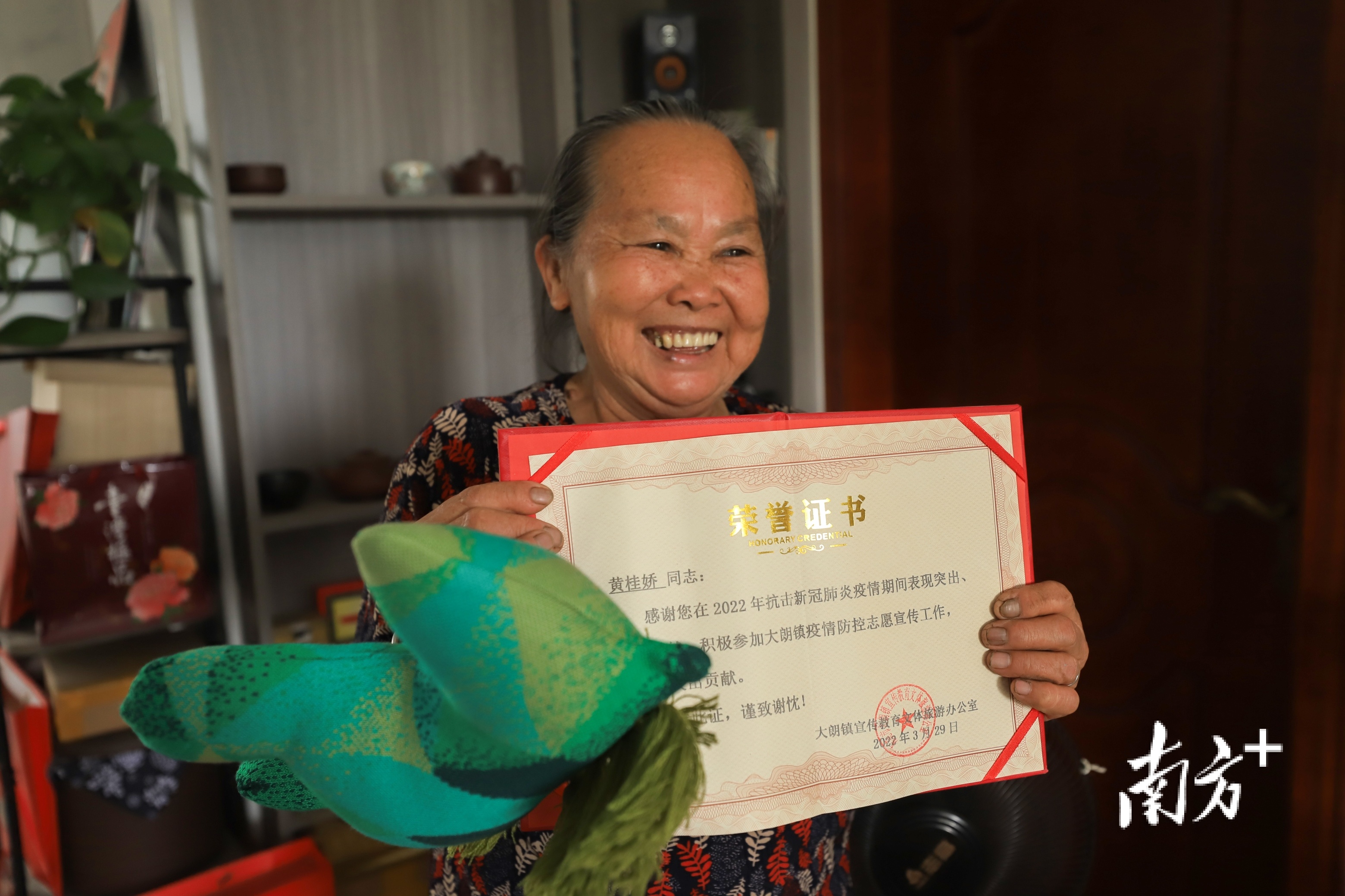 一直以来,黄桂娇都只是一个默默无闻的老人,闲来无事就种种菜、搞搞卫生,喜欢去社工服务中心找其他老人聊聊天、打打牌,或者参加一下社区活动,安然享受着晚年生活。前年底和去年初,在社工服务中心的推荐下,她先后两次参加了防疫短视频《老大有嘢讲》的摄制,这两段本地话的rap“串烧”,累计播放量达230多万,让她迅速在网络走红,她也因此获颁“积极参加疫情防控志愿宣传工作”荣誉证书。