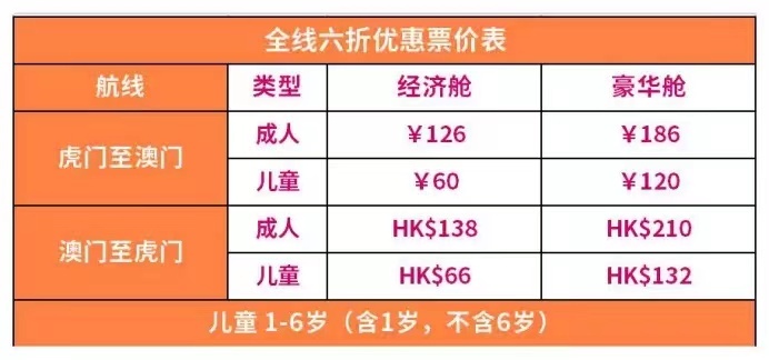 据介绍,此次复航经广东省疫情防控指挥部办公室同意,东莞虎门往返至澳门氹仔水上客运航线于2021年4月28日起恢复运营,每天1进1出,往来共2个航班:虎门至澳门10:00,澳门至虎门15:00。4月28日至4月30日将推出钜惠来回套票199元活动,5月1日至7月31日全线票价6折优惠。