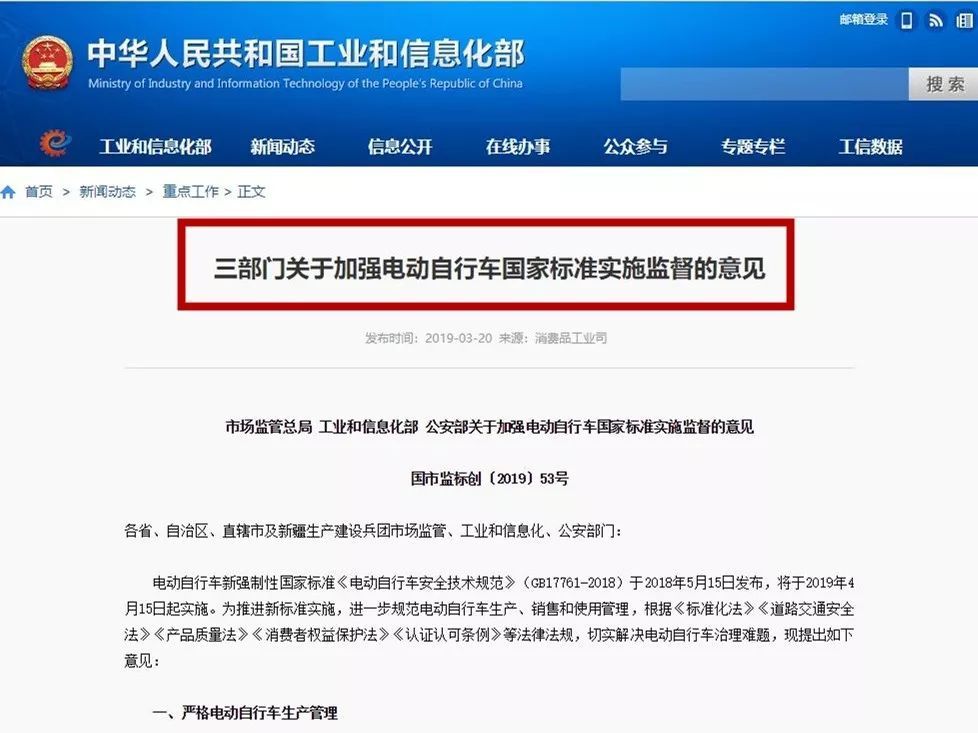 我国电动自行车新强制性国家标准,《电动自行车安全技术规范》将于2019年4月15日起实施。国家三部门联合出台《关于加强电动自行车国家标准实施监督的意见》要求: