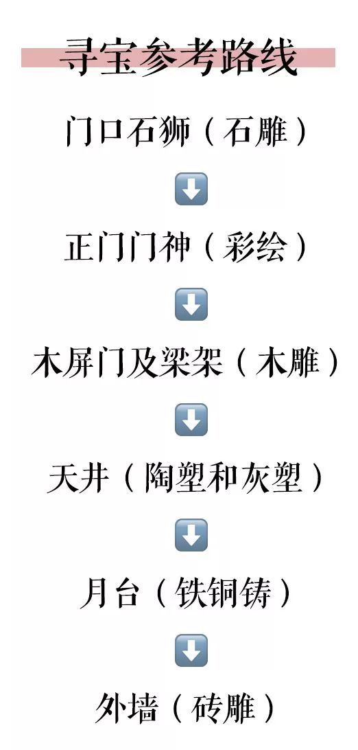 此外,木雕、陶塑、灰塑、铁铜铸、砖雕分别遍布在梁架、屋脊、墙壁、栏杆等各个角落,边走边赏,细心辨认,你会发现丝丝入扣的精细之美。(下图为建议游玩路线)