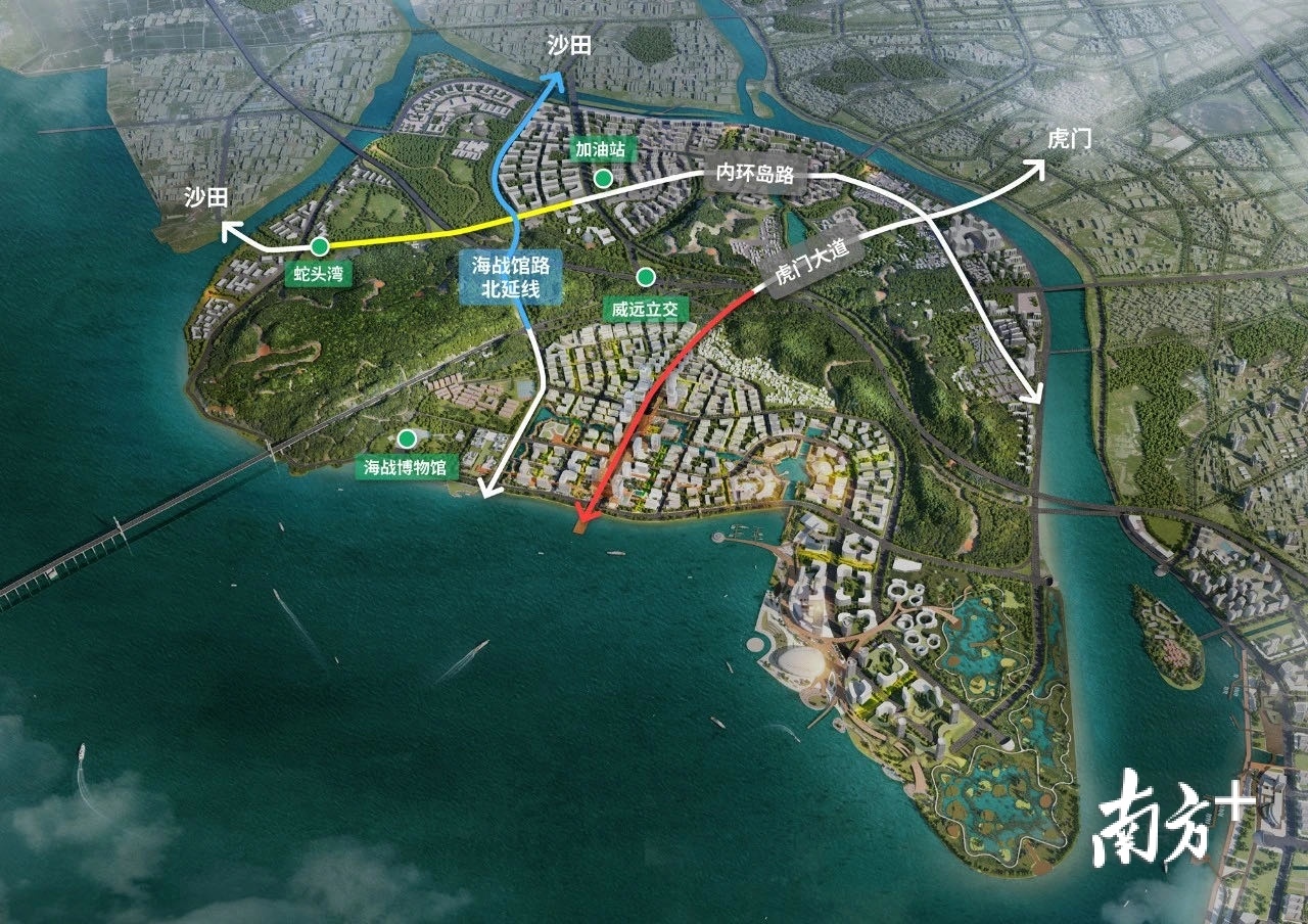这些道路完工后,威远岛上的主干道路将形成一个相对完整的交通圈。其中,东西走向的主要是内环岛路,而南北走向的则主要是虎门大道和海战馆路,将进一步方便周边居民的日常出行,畅通威远岛交通微循环,建设成内联外通的畅行交通路网。