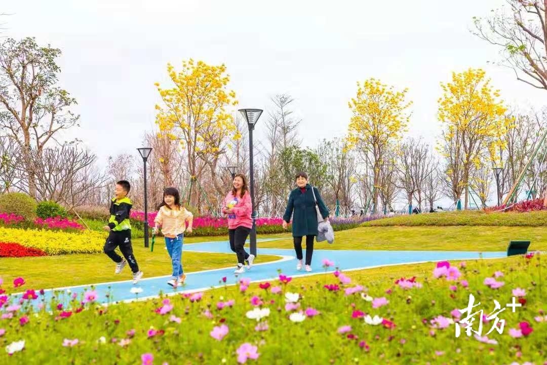沿着南海回溯至珠江口的茅洲河入海口西岸,在滨海湾新区,同样有一条40公里滨海景观活力长廊正呼之欲出。清澈的海湾波光粼粼,成群的海鸟驻足觅食,游览的人们欢笑声声,东宝公园从昔日临海的一片滩涂地变身为如今的花海,成为滨海景观活力长廊上的第一颗明珠。自去年正式迎客以来,已有近百万游客前来游览。
