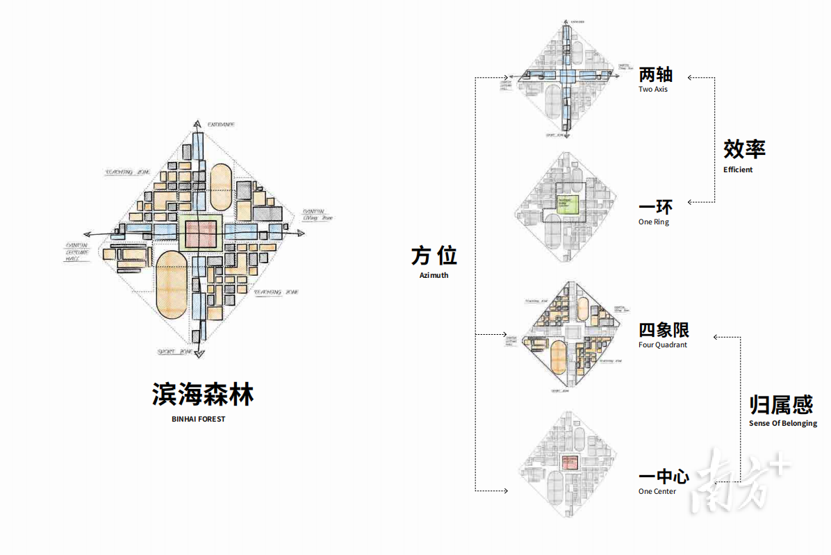 “四象限”则将学校划分为四大组团,包括“生活组团”“小学组团”“行政与公共教学组团”和“中学组团”。