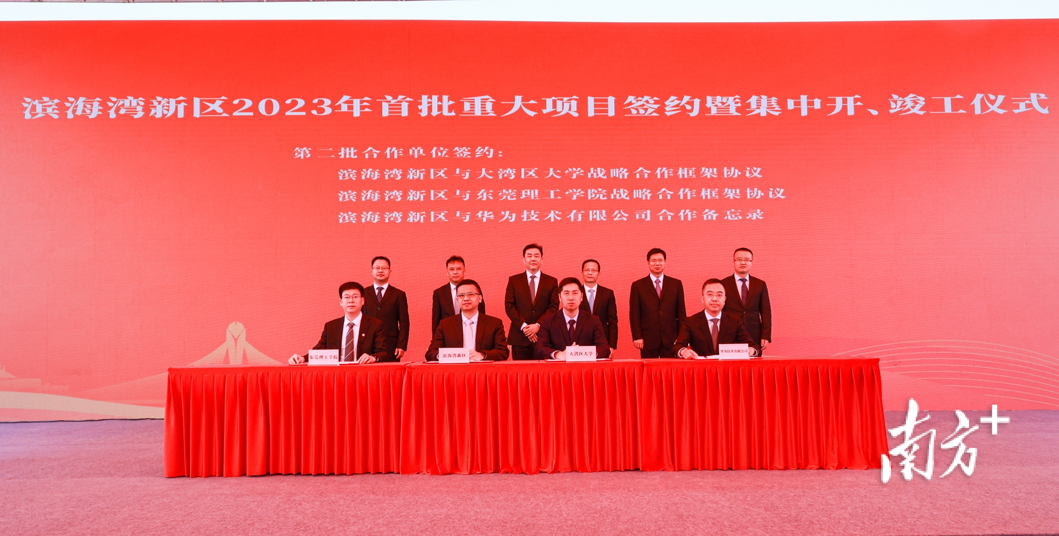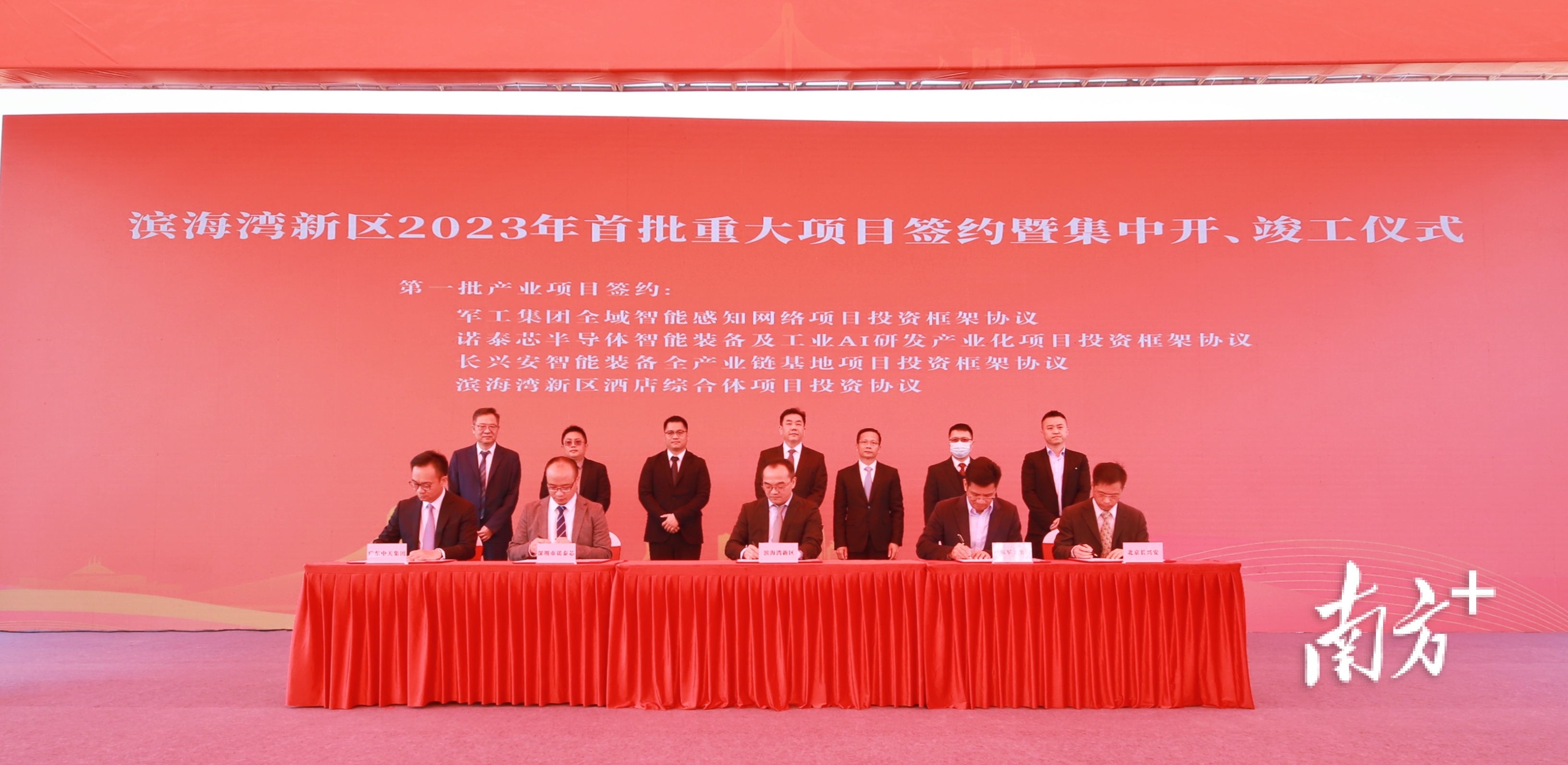 仪式上,滨海湾新区与广东中天集团签署投资协议,与广东军工集团、深圳市诺泰芯半导体装备有限公司、北京长兴安科技发展有限公司三家企业签署投资框架协议,并与大湾区大学、东莞理工学院以及华为公司签署战略性合作协议。