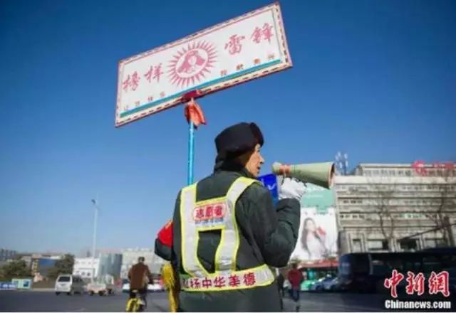 七旬老人举“学雷锋”标牌