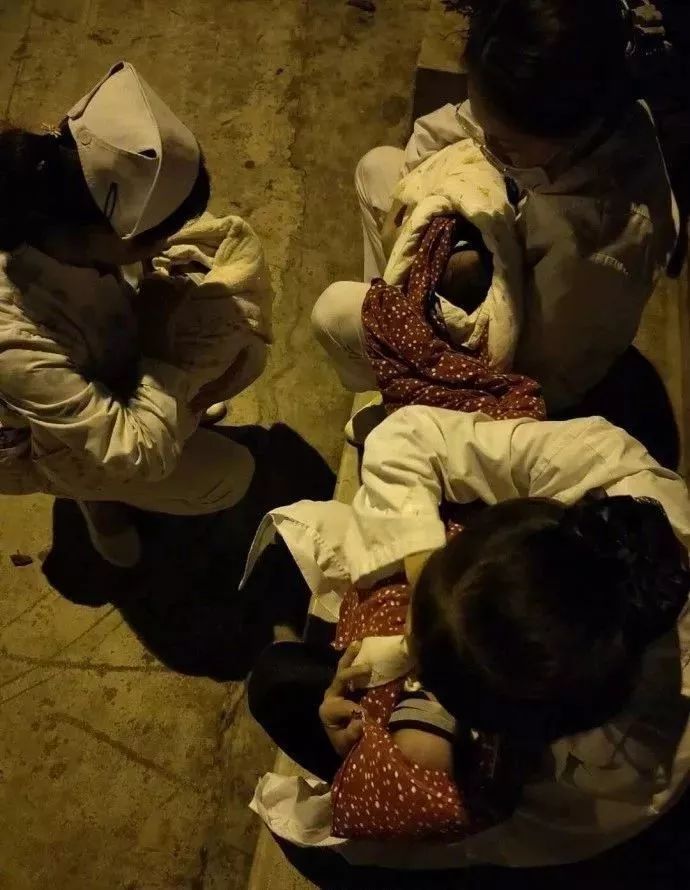 抱新生儿蹲室外避震的护士们
