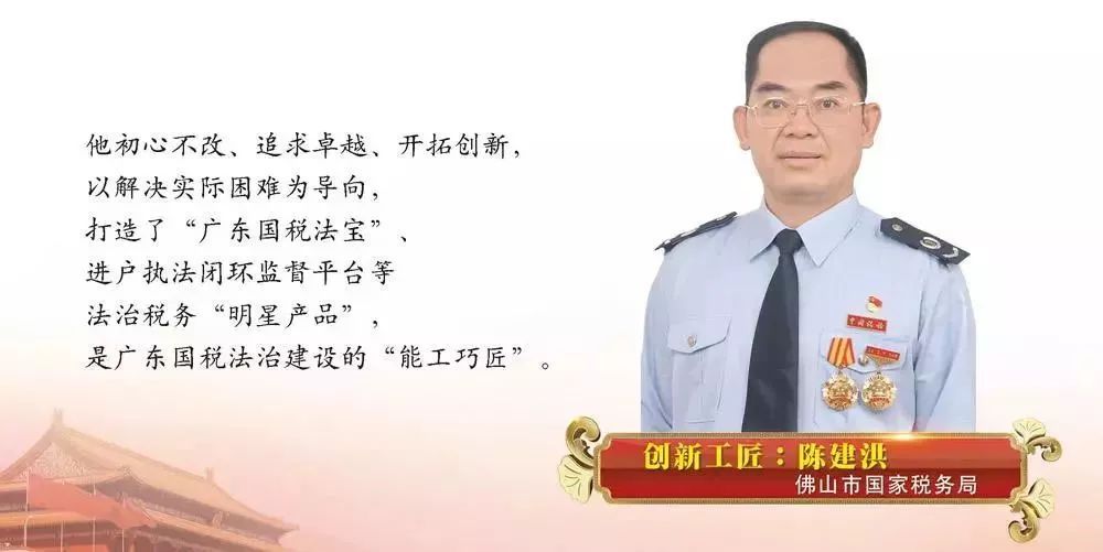 陈建洪,佛山国税法治建设的首席“工匠”。他本人先后荣获2016年佛山市职工创新标兵示范岗、佛山市国税系统先进个人和国家税务总局的“各省(区、市)税务局先进工作者”、 2017年广东省五一劳动奖章和广东省国税系统“五带头”优秀党员等荣誉称号,成为了佛山市乃至广东省国税系统创先争优、敬业奉献的典型模范。