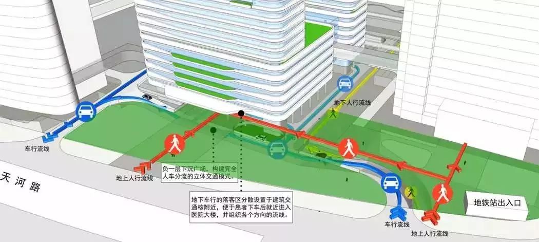 位于天河区的中山大学附属第三医院是一所的大型综合性三级甲等医院。为改善医疗科研及住院环境,优化调整院内医、教、研用房的布局,规划新建外科住院综合楼:拆除沿天河路现13层高门诊楼,拟建地上25层,地下4层。同时院内整体设置地下负一层大堂及交通枢纽;改造医院正门人行广场,设置负一层通道于BRT,地铁站直接连接,构建完全人车分流立体交通模式。