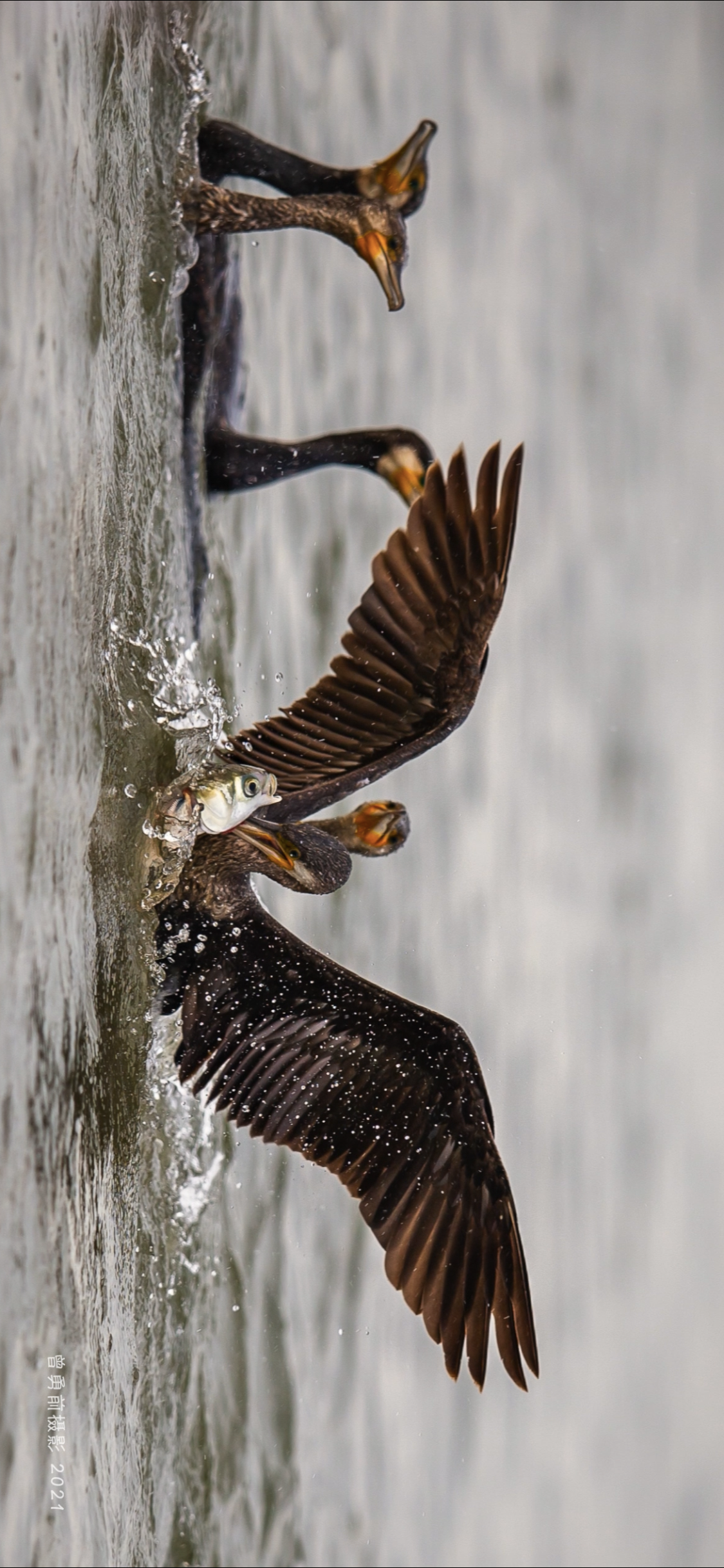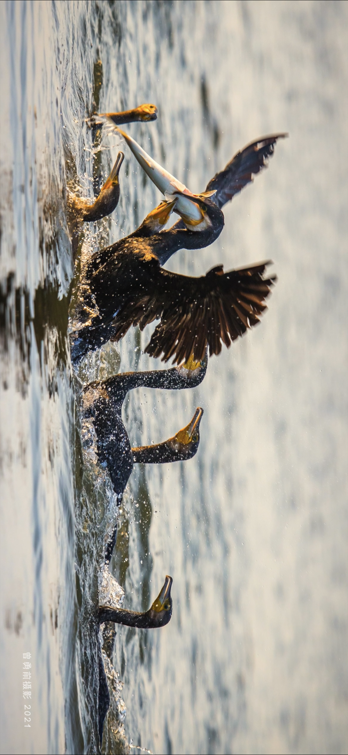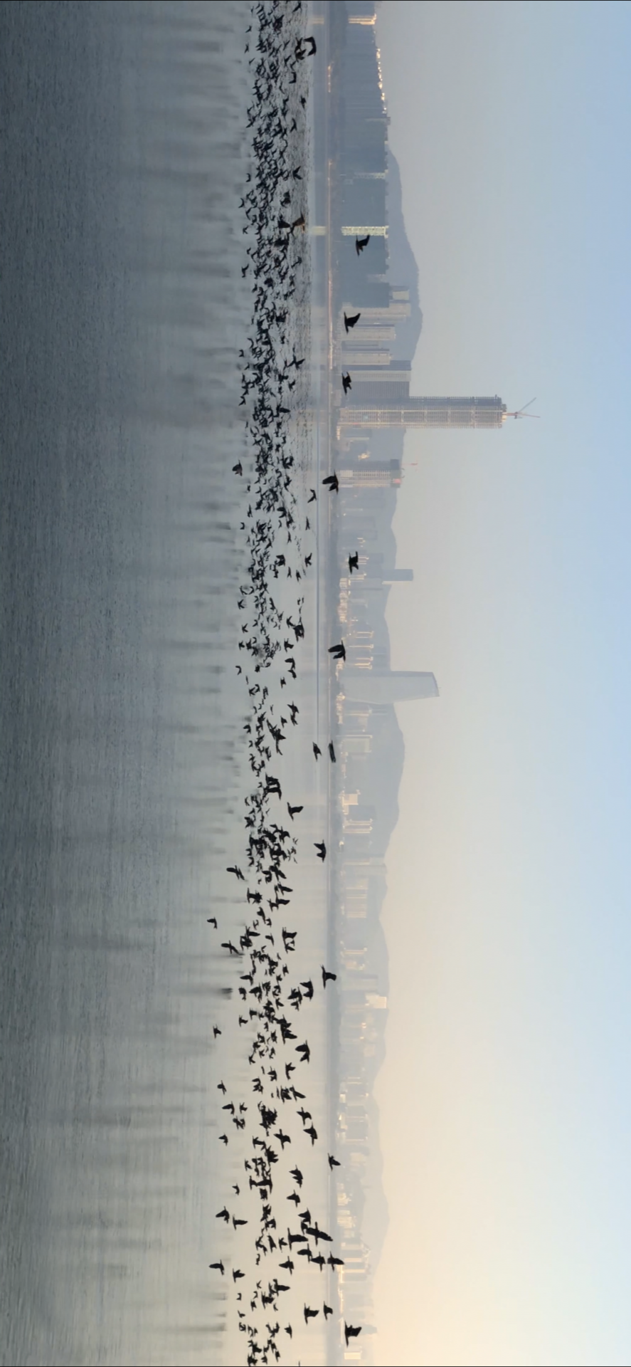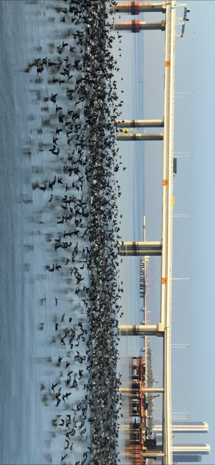 “那群鸬鹚一开始在海中间漂浮着,突然有只领头鸟开始起飞,黑压压的鸟群瞬间扑面而来。”由于鸟群越飞越近,曾勇前一开始用专业长焦距“大炮”只能拍到几十只,他灵机一动,赶紧拿出手机,打开广角镜头,完整地捕捉到了这一幕。“这些鸟先是贴着水面飞,然后绕过栈桥 ,又飞到桥头 ;紧接着,它们调转方向,飞向‘春笋’大厦 ,不一会儿,又飞到海中间。在飞到桥头的一瞬间,它们离我很近,为了完整地记录万鸟齐飞的画面, 我换了四个角度才拍到了全貌。”说起拍摄过程,曾勇前仍兴奋不已。