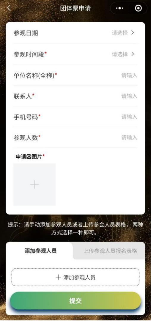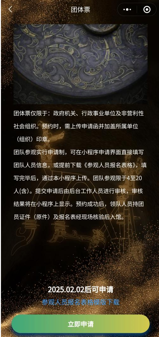 团队观众参观实行申请制,团队参观限4至20人(含),团队领队人员可在小程序“团队票”申请界面填写团队人员信息,或提前下载《参观人员报名表格》填写,通过小程序上传。