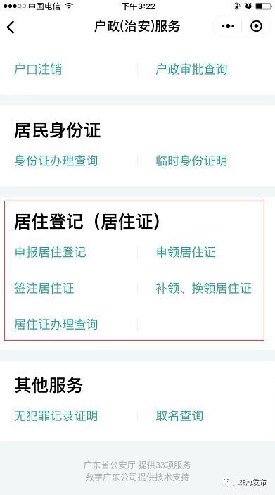 在服务的“户政(治安)”找到“居住登记(居住证)”板块选择“申报居住登记”;