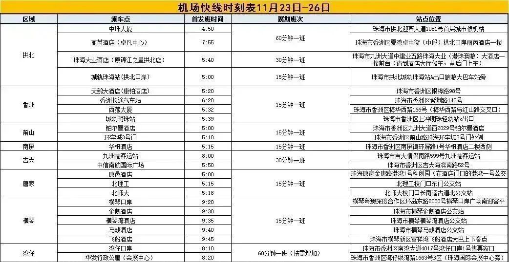 11月23—26日,机场快线将增加拱北、香洲、吉大、前山、横琴、湾仔、南屏、唐家至珠海国际航展中心往返班次。