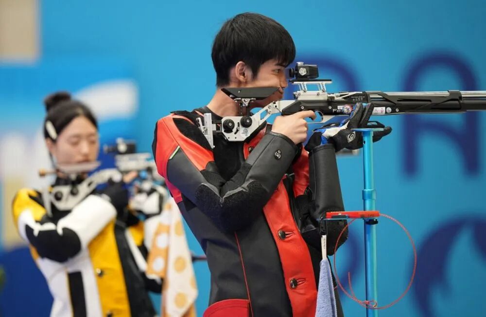 在射击男子10米气步枪决赛中,中国选手盛李豪以253.3环的成绩夺冠,并打破该项目世界纪录;