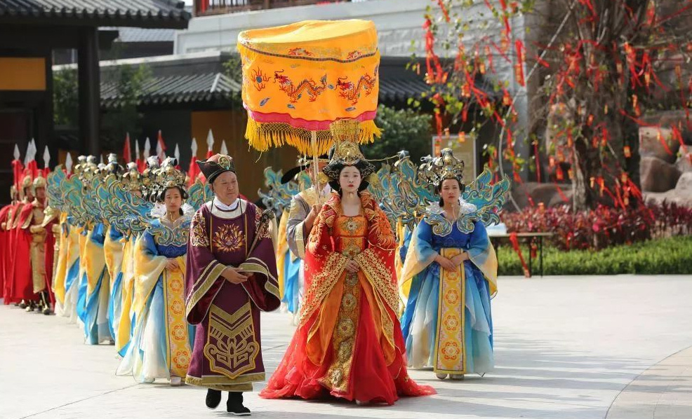 禅域小镇内青砖红瓦,亭台楼阁,1:1还原场景,还有真人演员扮演武皇巡游,让大家穿越盛唐世界。
