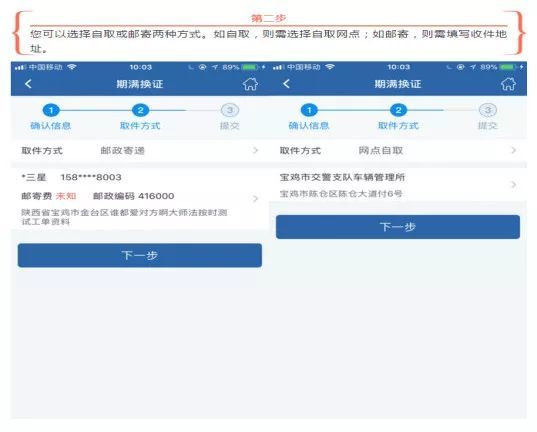 取件方式确认后,点击【下一步】,进入期满换证提交页面,再次确认所填资料信息无误后,获取手机短信验证码,校验通过后,点击【提交】按钮,完成期满换证业务申请信息提交。提交成功后,您可通过【首页】→【网办进度】功能随时查看业务办理进度,网办中心工作人员将在1个工作日内受理您的业务。