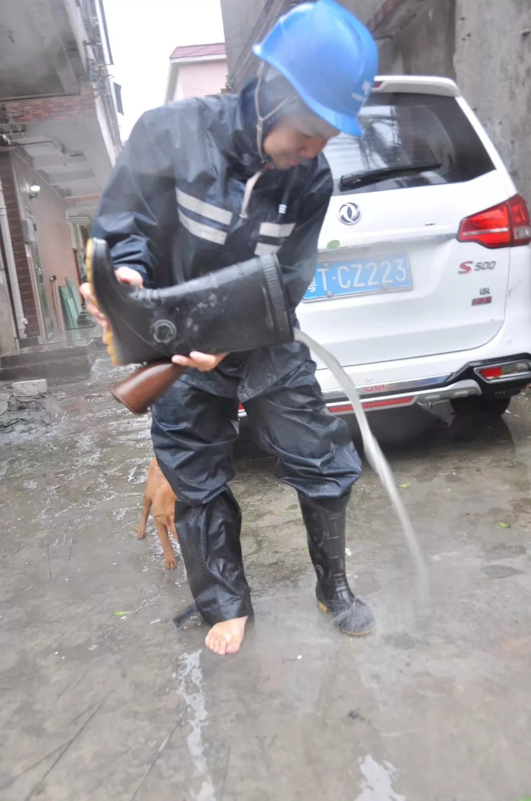 一名三乡供电分局员工冒着风雨出去抢修,不一会鞋肚子里就能倒出一个水柱!防水的水鞋已经成了“水做的鞋”。