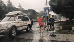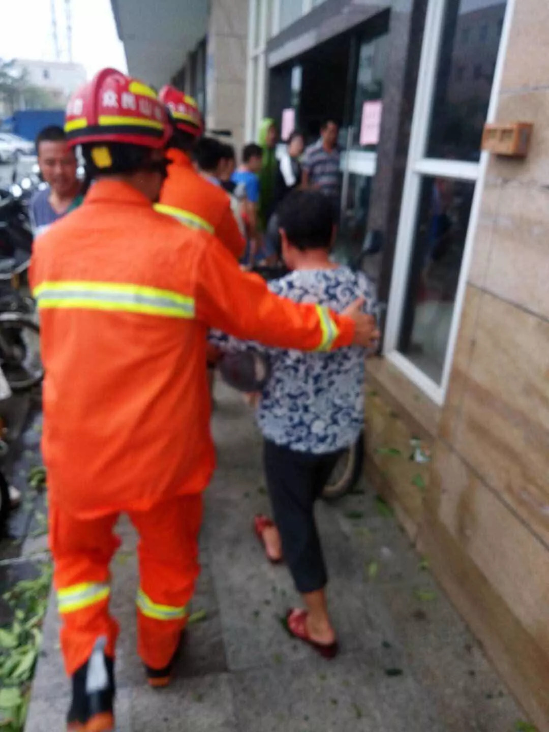 人民医院急诊门口,保安顶着强风狂浪帮助病人把摩托车移入安全区