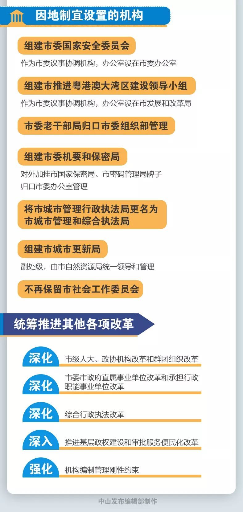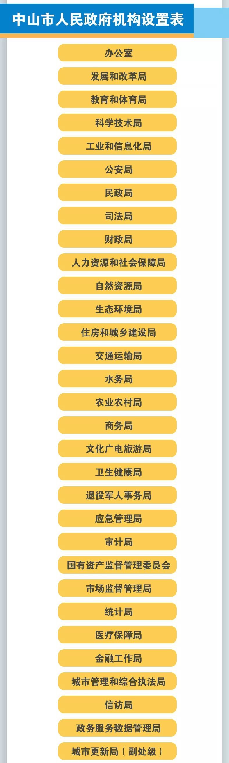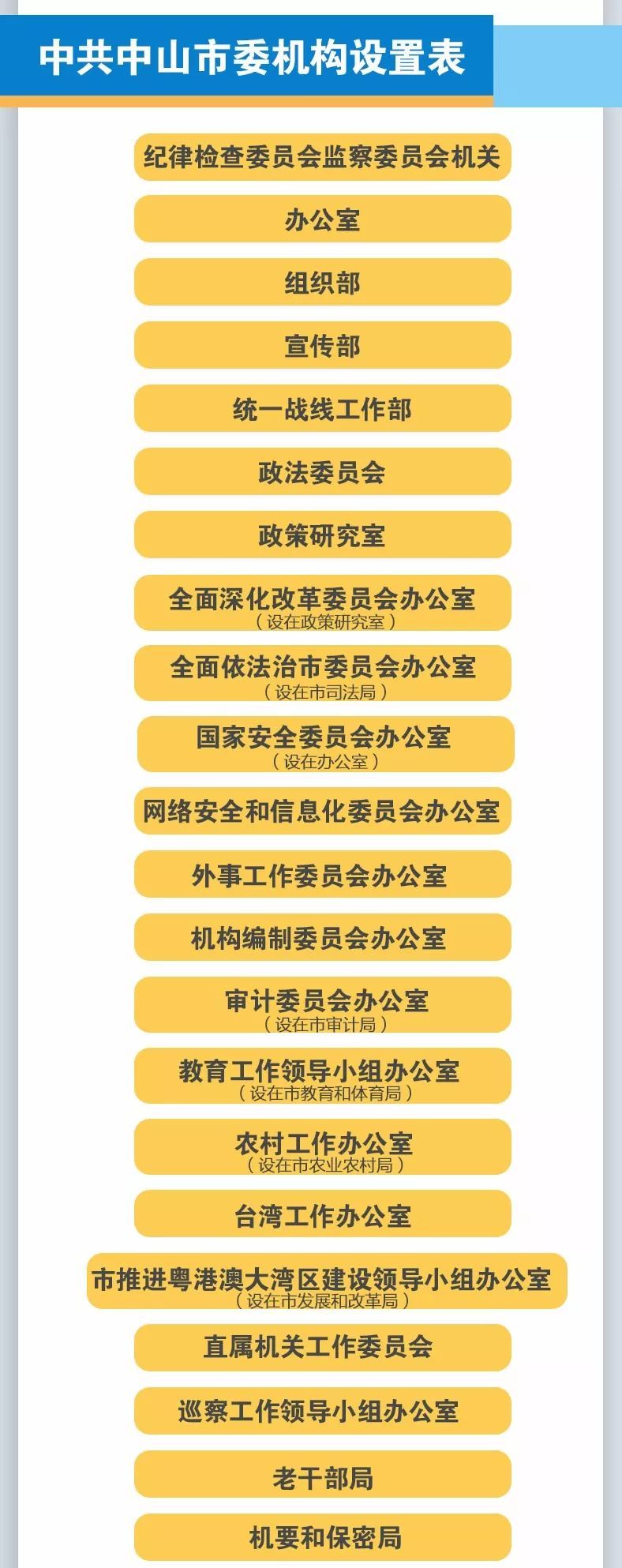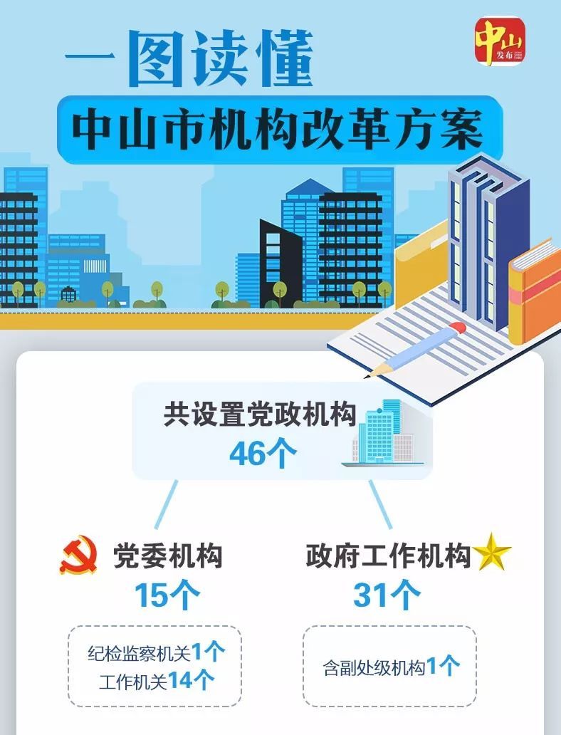 近日,《中山市机构改革方案》经省委、省政府批复同意,标志着我市机构改革进入全面实施阶段。改革后,共设置市级党政机构46个,其中,党委机构15个、政府工作机构31个。