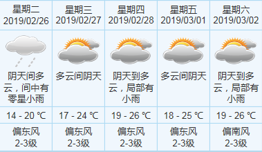 预计中山今天阴天间多云,间中有零星小雨,气温14~20°C。 近期早晚易出现轻雾,并伴有轻微的“回南”现象,请注意家居防潮。
