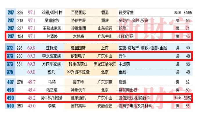 《新财富》杂志发布2019年新财富500富人榜,今年中山有3组人入选榜单,比去年增加一组。木林森掌门人孙清焕以97.1亿元人民币的身家,成为中山“首富”。