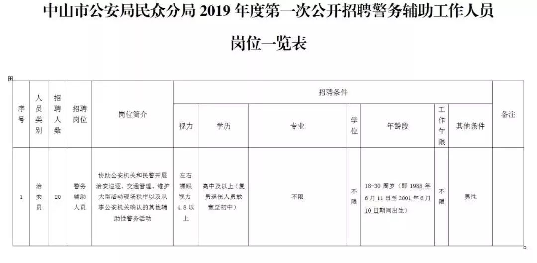 中山市公安局民众分局面向社会公开招聘20名警务辅助人员。报名时间6月10日至6月14日。详情请致电0760-23185101