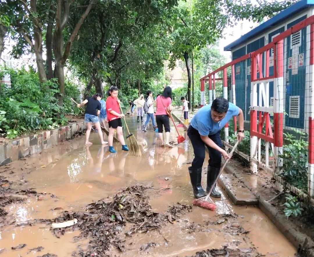 昨天暴雨过后,三乡光后中心小学80多名老师、近200名家长学生、消防官兵、环卫工人通过近3个多小时的共同努力,完成了学校灾后清洁工作,确保第二天的正常上课。