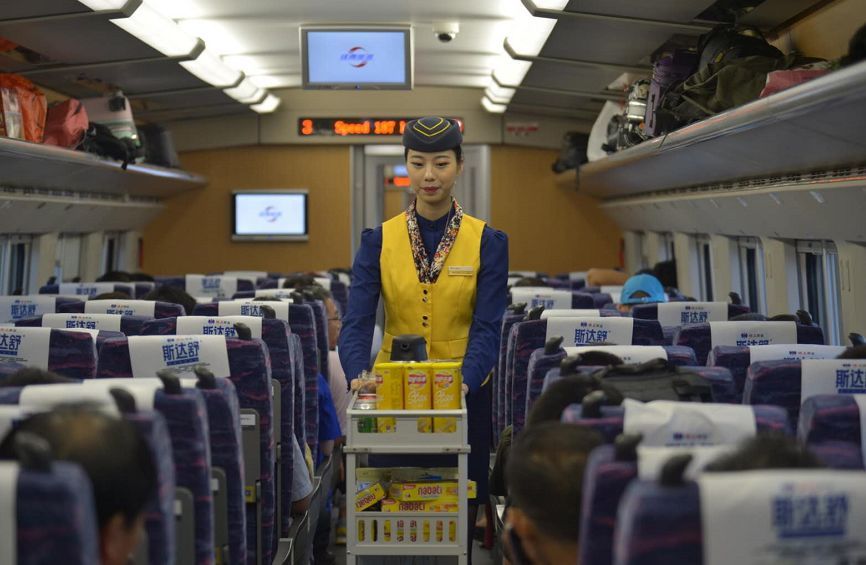 记者了解到,本次列车采用的是“和谐号”动车组,挂8节车厢,每节车厢满载70—90人不等。车厢内宽敞、明亮、整洁,配有可旋转座椅和插座,方便乘客调整座位、为电子设备充电。