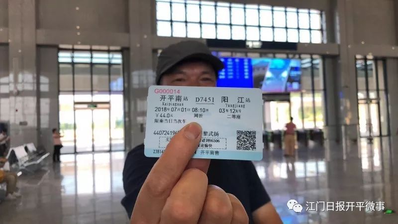 家住开平的黎武扬,是开平摄影家协会会员。他告诉记者,这次特意赶过来体验首发车,并用手中的镜头记录下这一瞬间,此外他还是第一个拿到开平南站车票的旅客。黎武扬说:“盼望已久的江湛铁路终于开通了,将来出行会更方便,很激动、很开心,特意在铁路开通的第一天带着家人一起前往阳江游玩。”