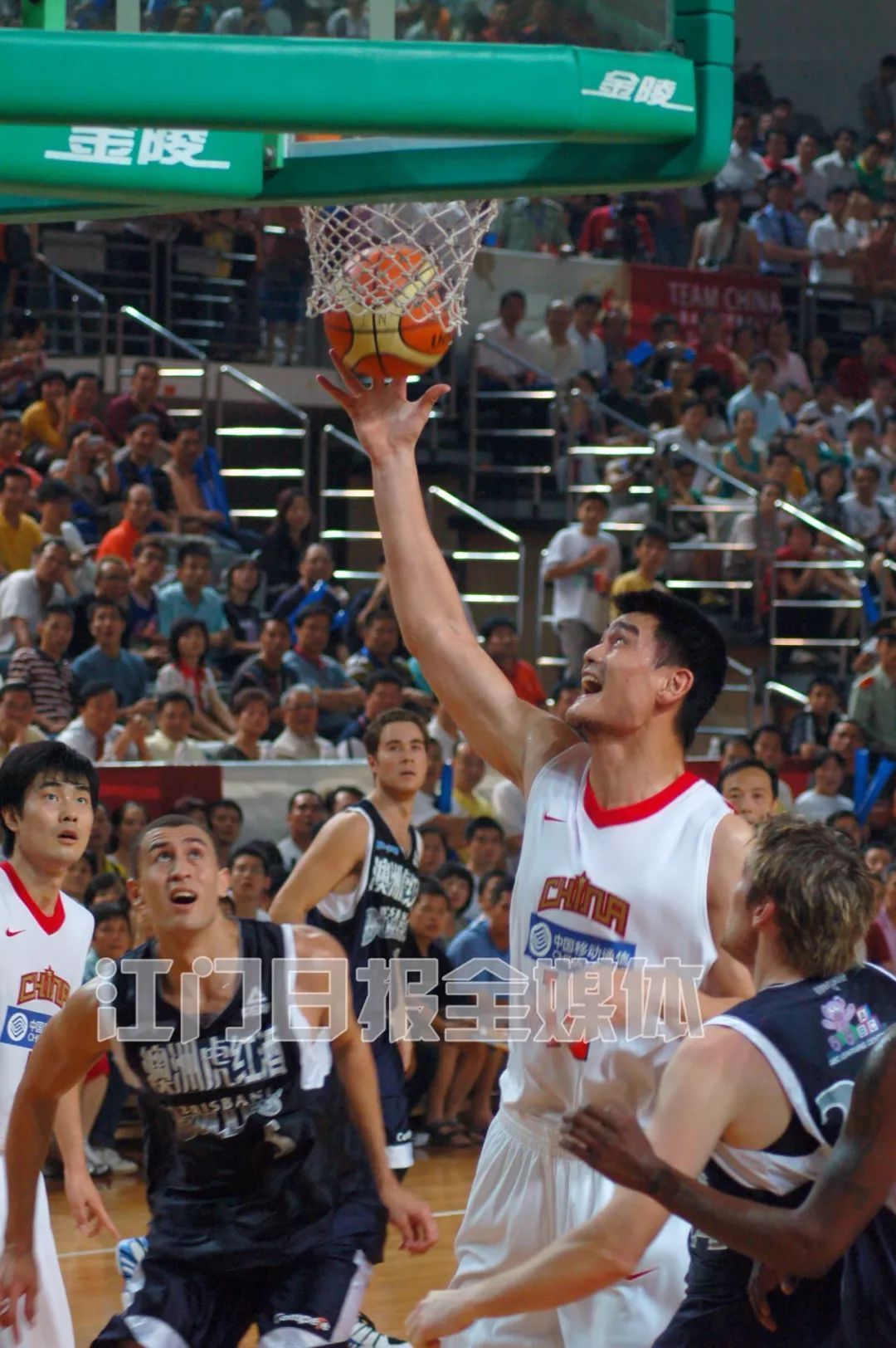2007年9月23日晚,新会体育馆群星闪耀,姚明、易建联、王治郅等中国男篮队员纷纷亮相,为蜂拥而至的我市球迷上演了一场精彩的篮球赛事。特别是鹤山籍球员易建联,在家乡父老的助威声中彻底爆发,上场不到20分钟拿到全队最高分20分,帮助中国男篮以82:65复仇澳大利亚布里斯班子弹队。王鼎强 摄