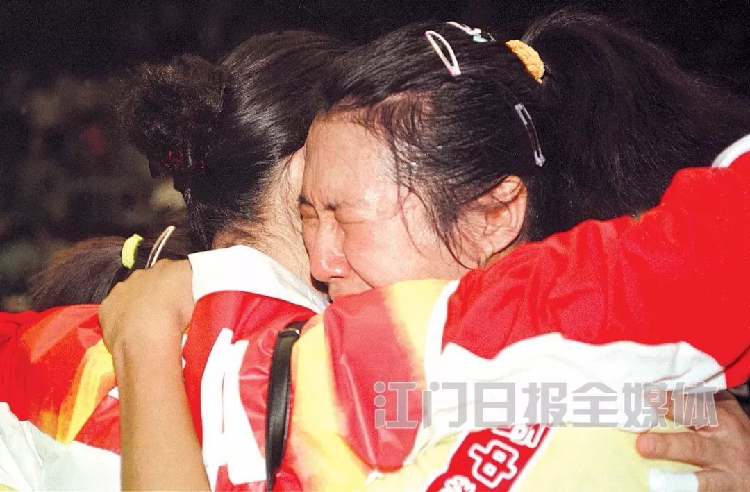2001年10月24日,第九届全运会江门赛区决出首金,女排解放军队以3:1战胜辽宁队,图为夺得冠军后队员欢呼雀跃,喜极拥泣。
