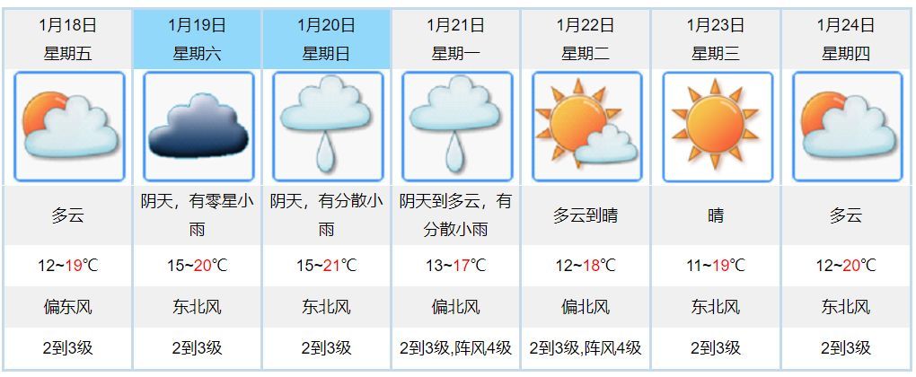 今天,多云,初时部分地区有零星小雨,气温介于12到17度,早晚较冷,请注意添衣保暖。预计,18日多云为主,早晚较冷,最低气温12度;19至20日气温逐步回升,但雨雾趋明显,需注意交通安全。展望20日夜间受新一股冷空气影响,气温再次回落并伴有分散小雨;22日起转晴冷天气。