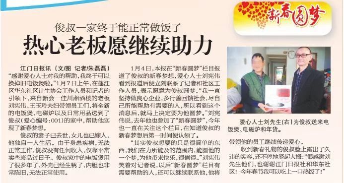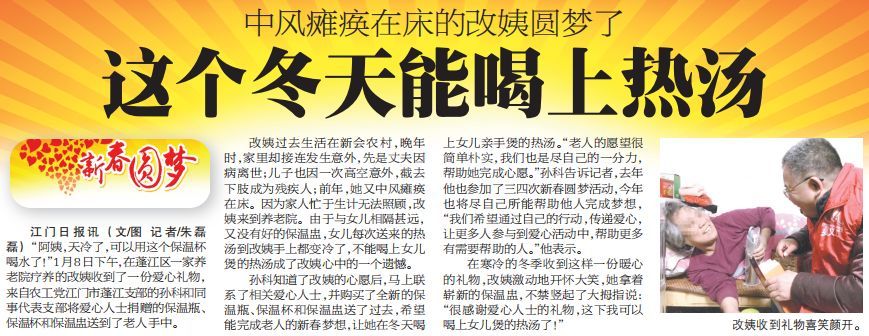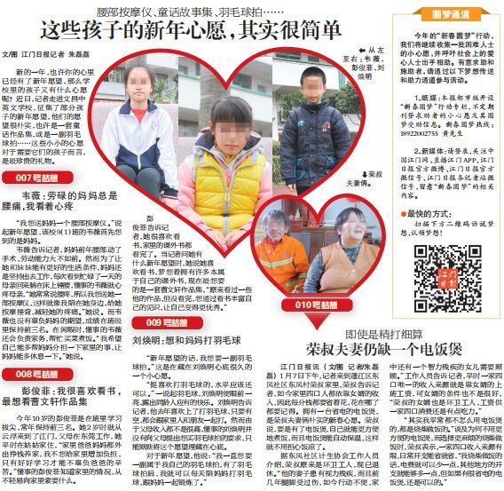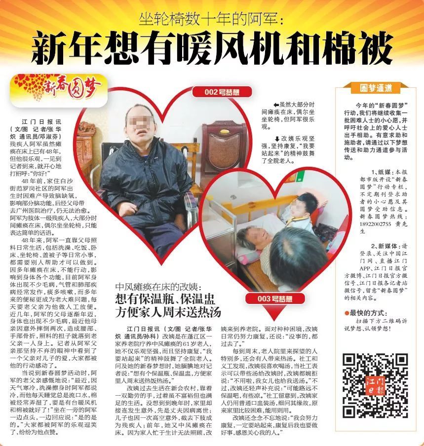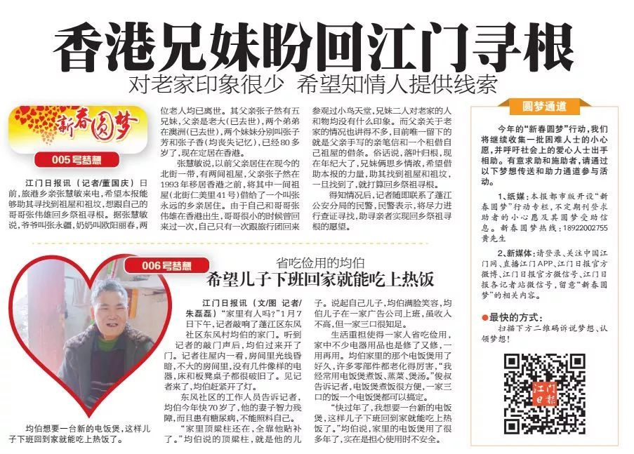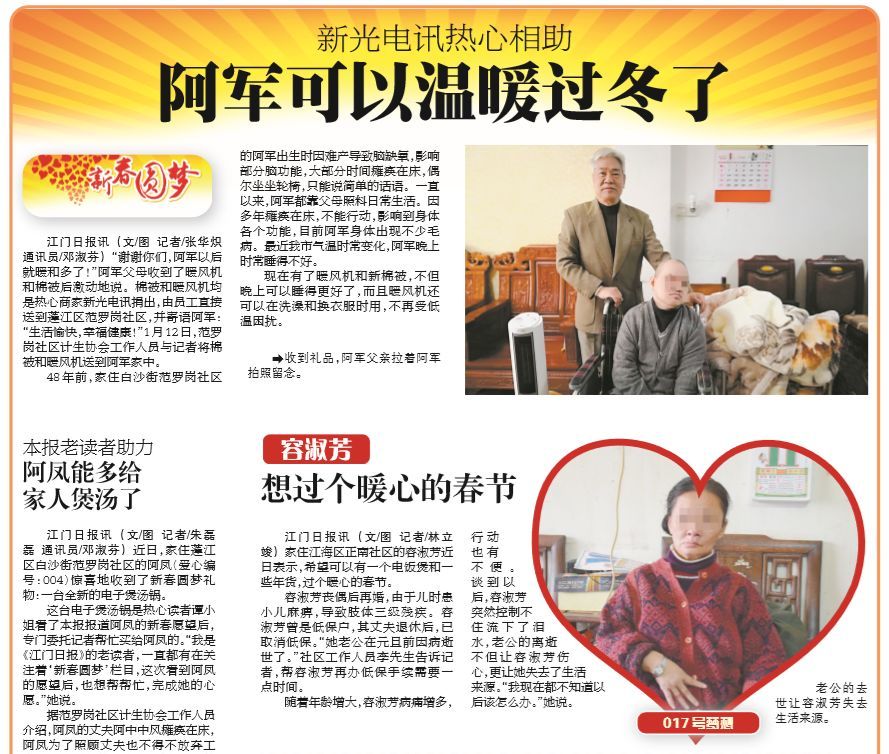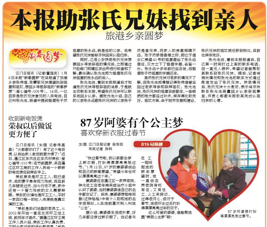 1、纸媒:江门日报都市版将开设“新春圆梦”行动专栏,不定期刊登求助者的小心愿及其圆梦受助信息。