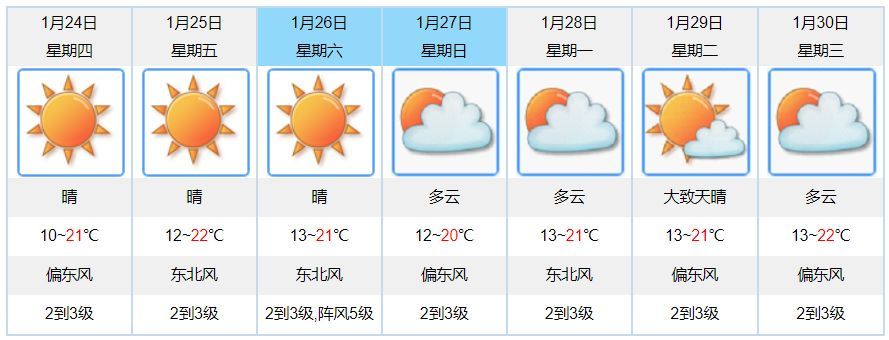 今天晴,气温9到20度,昼夜温差大,早晚较冷;天气干燥,注意适时补水。预计未来一周持续晴朗,适宜节前清扫和晾晒。天气连续干燥,火险指数上升,请注意森林防火和家居用火、用电安全。