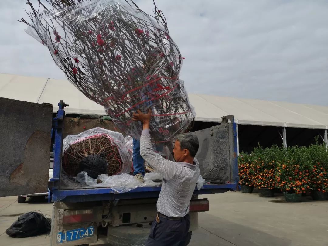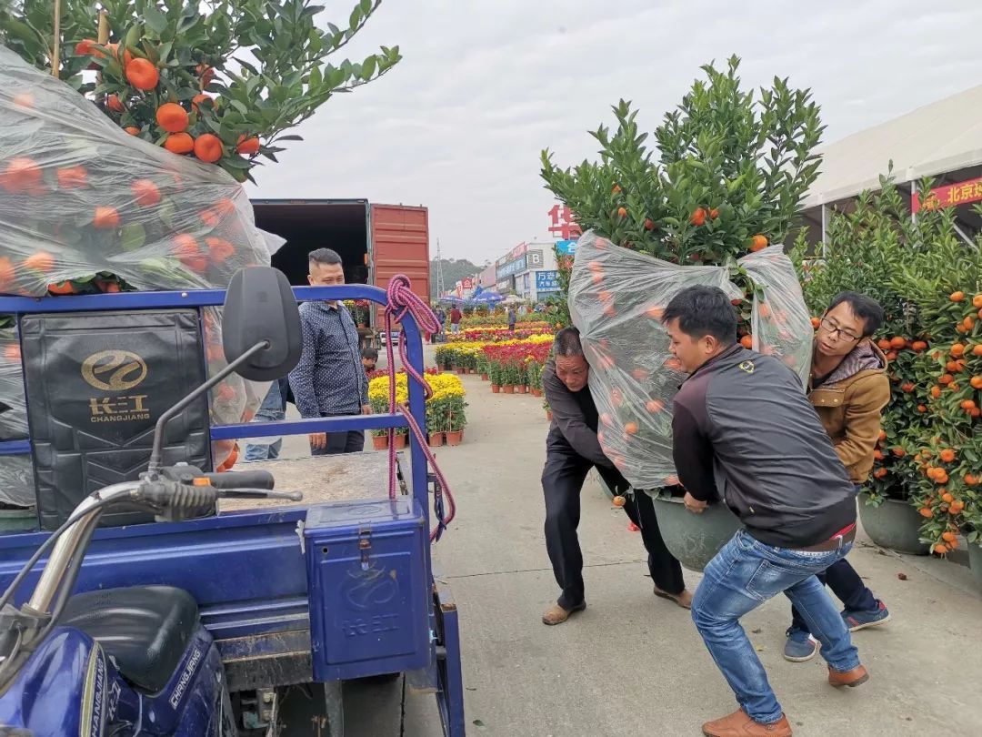 在蓬江区最大的花市——华鸿广场花市,记者见到,一辆辆满载桔子、花卉的大货车、三轮车来来往往,花农、桔农们正忙着搬运花卉、盆桔,不少市民早早就来到广场,仔细物色自己的目标。