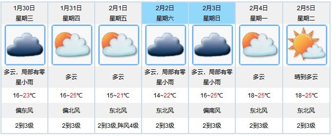 今天,多云,气温15到23度,昼夜温差大,请注意适时增减衣物;另外,天气干燥,注意补水。预计30日多云为主,部分地区有零星小雨和轻雾;31日夜间受冷空气影响,北风加大,气温小幅下降。近期火险指数高,请注意用火安全。