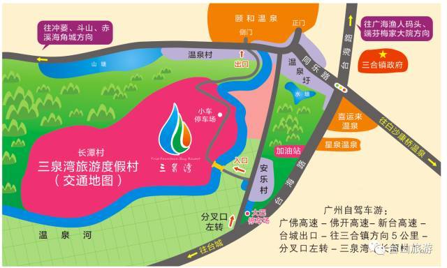 台山市三合镇拥有丰富的温泉资源,有颐和温泉城、喜运来温泉、星泉温泉等景区。最近出现了一个乡村旅游景点——长潭村三泉湾,村后是山,村前有河流和田野。经过河道上建于上世纪的小桥,映入眼帘的是一排造型精美的洋楼。