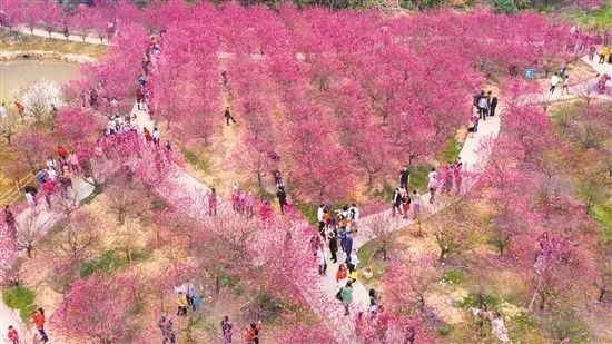 在白水带桃花园,桃花开得很鲜艳,前来赏花拍花的市民游客络绎不绝